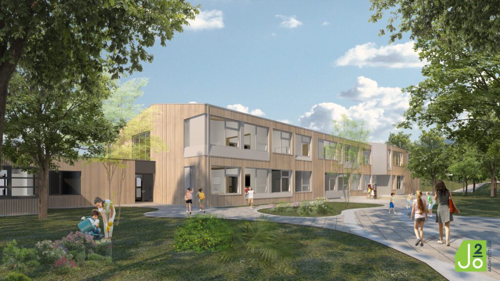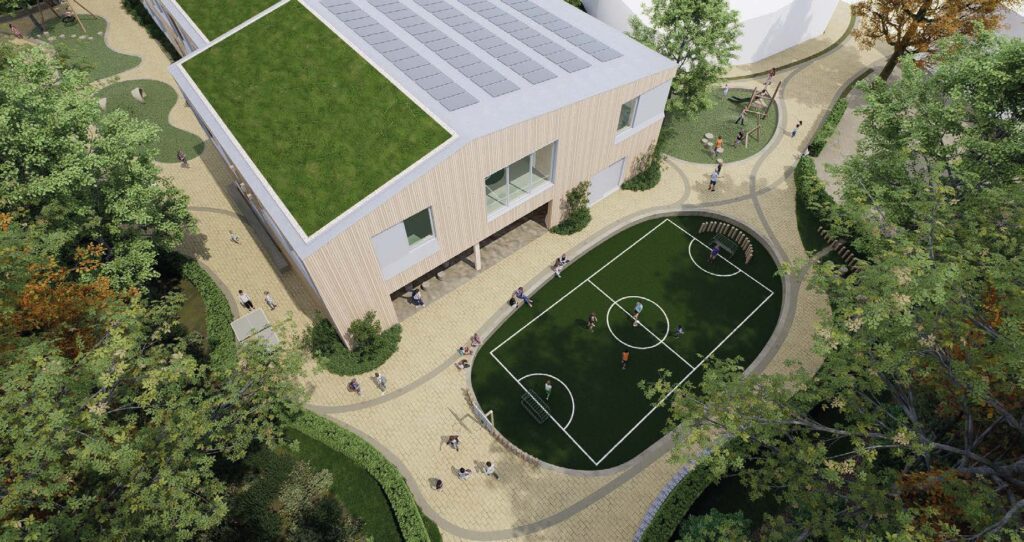 Om te benadrukken dat er een Kindcentrum komt, zal de nieuwbouw vast zitten aan het bestaande deel. U ziet dat de huidige laagbouw dan plaats maakt voor een modern schoolgebouw met twee verdiepingen.
